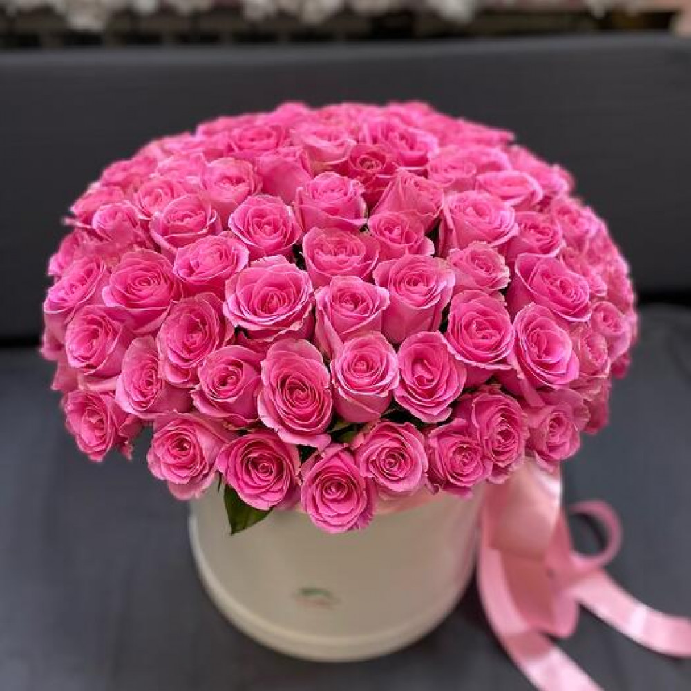 101 Розовая Роза в Коробке - Нежность и Элегантность Подарите великолепие и изысканность с этим потрясающим букетом из 101 розовой розы, представленных в элегантной коробке. Розовые розы символизируют чистую любовь, нежность и грацию, делая этот букет идеальным для самых значимых и запоминающихся моментов.