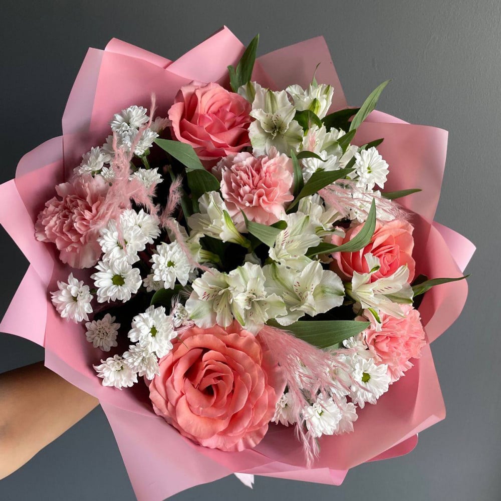 Букет из роз, альстромерий, лизиантуса, пионовидных роз и зелени с доставкой по Казахстану – это изысканная и романтичная композиция, идеально подходящая для торжественных событий и особенных моментов. В этом букете гармонично сочетаются различные цветы и зелень, что придаёт ему неповторимый стиль и очарование.